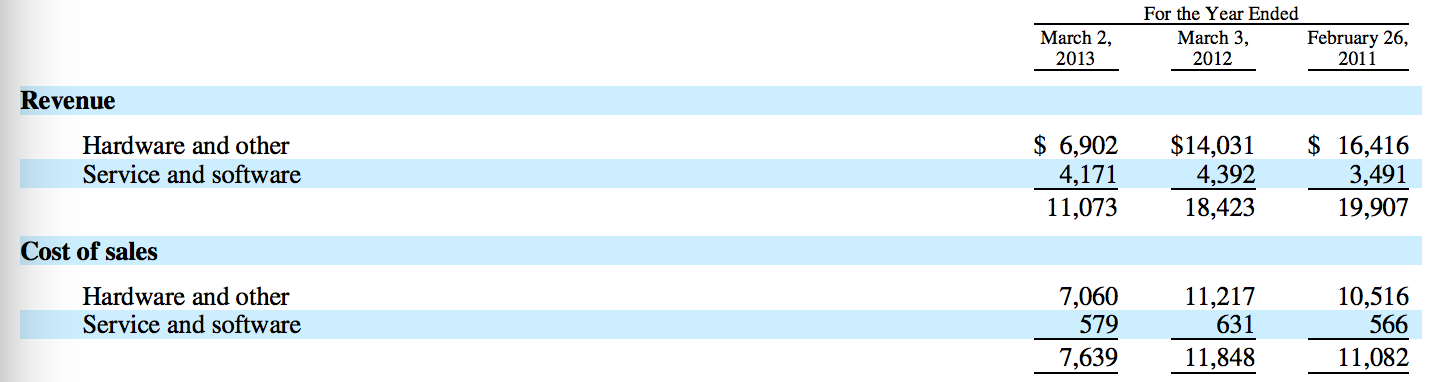 How does hardware compare? Well, for BB10 hardware to be worth it for BlackBerry, it has to generate as much, or more, gross profit over three years.