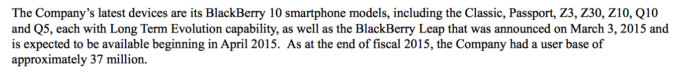 At the end of February 2015, the subscriber count was 37m. The total number of handsets that reached customers (“sell-through”) in the past eight quarters since BB10 was launched two years (eight quarters) ago is 26.2m. Digging back reveals how many BB10 handsets have actually shipped to end users – surely replacing existing BB7 handsets: just 10.1m.