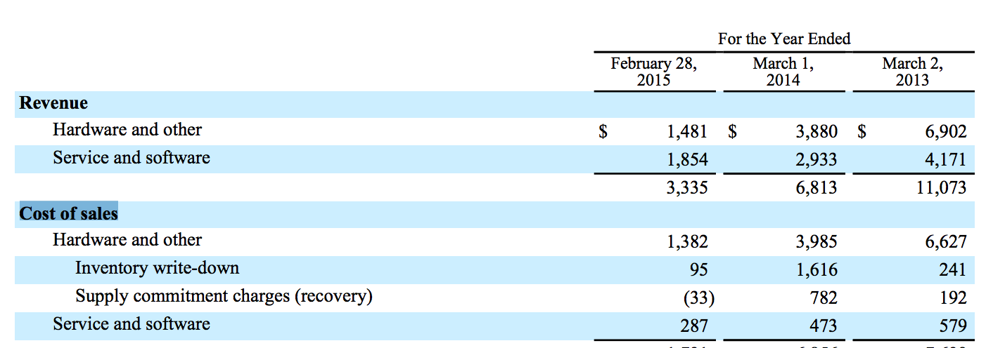 Services and software together have a gross margin of nearly 85%, compared to hardware gross margins which have wavered between 4% in FY13, -2.7% in FY14, and 6.7% in the latest year. (They were as high as 36% back in the year to March 2011, when it shipped 52m handsets, and 20% in the year following, when it shipped 49m. In the just-gone year it shipped 7m. You don’t get 20% margins at that scale.)