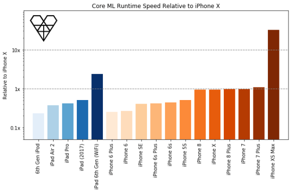 Core ML performance by device. Higher is better. Note the y-axis is logarithmic. Data from Fritz.This Core ML model runs over 10X faster on the A12 processor in the iPhone XS Max compared with the iPhone X. The model above performs object detection, and results vary from model to model. The smallest speed-up I saw was around 5x. I also found it interesting that the A10X Fusion processor in the 2018 iPad beat out the iPhone X. In other benchmarks, the processors appear fairly similar, but perhaps there are differences in memory.