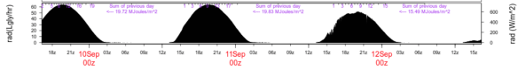 The wildfire smoke has a profound impact on surface temperature, causing cooling by reflecting the sun’s rays back to space and absorbing some of it aloft. That is probably obvious to most of you from being outside yesterday, but consider the radiation measurements on the roof of my building at the University of Washington (see top panel below). Much less radiation yesterday (a drop of 22% from 19.83 to 15.49).