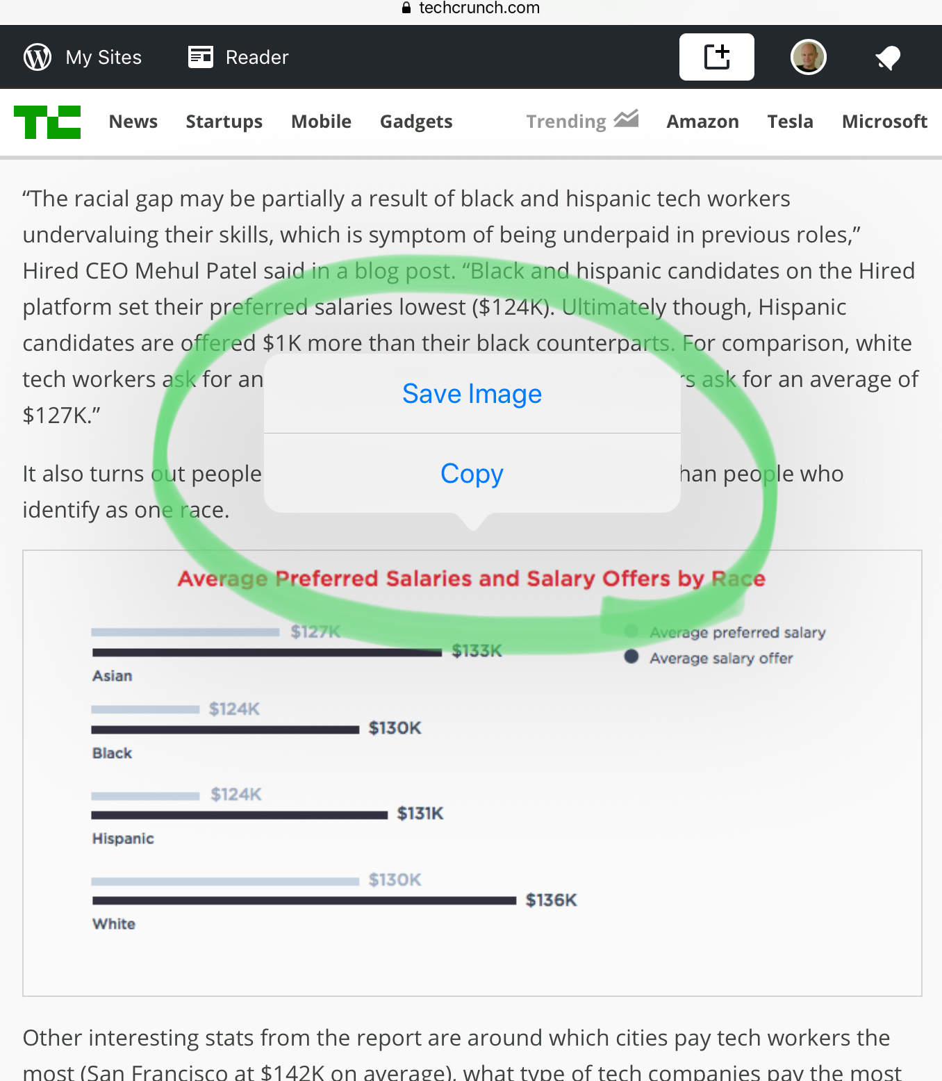 • can’t grab inline image URLs. There isn’t a way that I can see on the iPad to find the URL to an image on a Safari page and directly copy that. It might be possible with a bit of scripting (input some text before and after the picture; script grabs the source, looks for image links between those words). Solution: presses on the image and choose “open in new tab” and grab the link from that tab. But it’s an extra step, and isn’t always available – take the example below from Techcrunch.