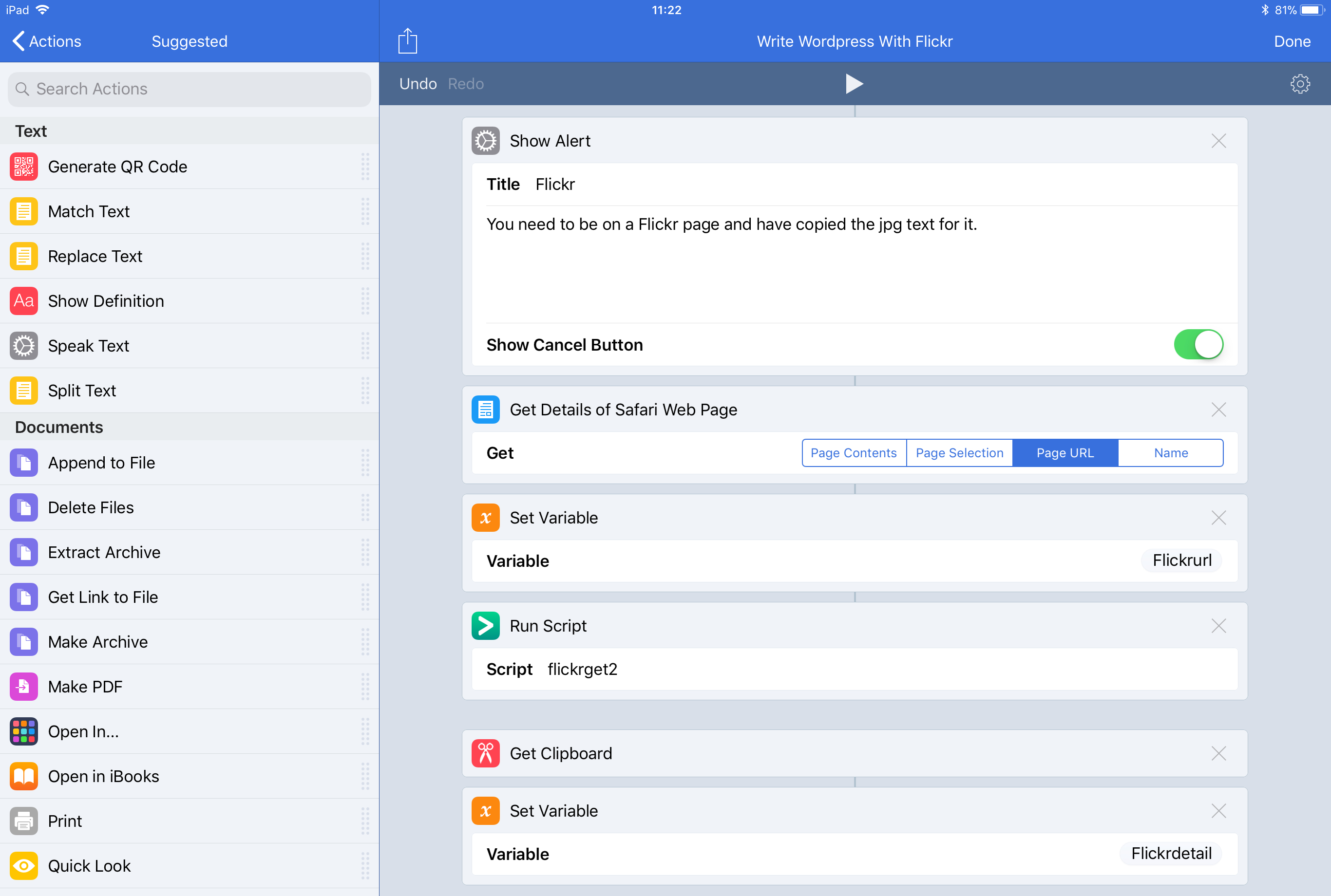 The most complex part of those is composing The Overspill, where I use a mixture of Instapaper, Pinboard and WordPress for the raw content. On the Mac, I collect the links and content and comment using the Javascript supplied by Pinboard. But that’s not available (or wasn’t) on the iPad, so I used Workflow to write an Action Extension: when I’m on a page, I select the text, hit the Share button and choose “Run Workflow”, and I can put the selected text – with a comment – into Pinboard. It’s actually better than on MacOS, because Workflow has options so you can grab the author name from the page meta-content.