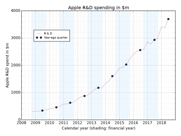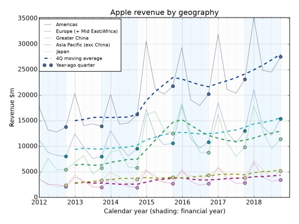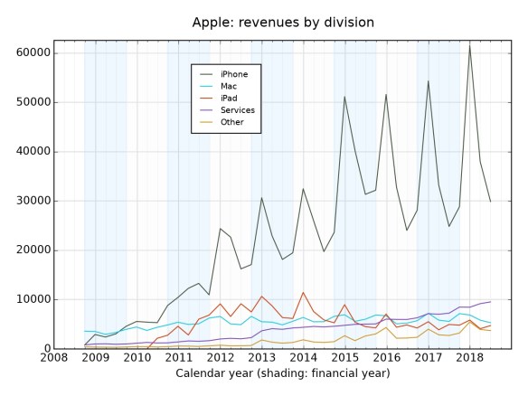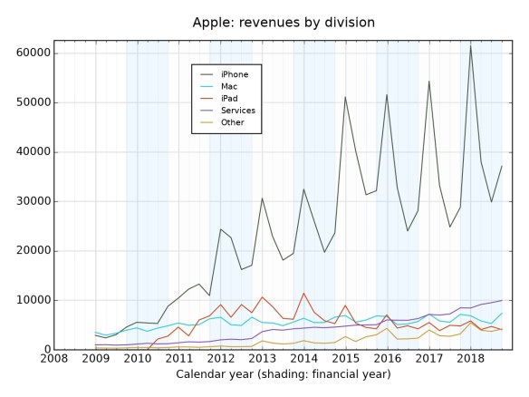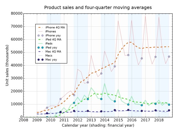 With many thanks to Dr Drang, I’ve been shuffling Python for the past, oh, a while, using Pythonista and its included matplotlib, plus of course Apple’s financials, to put together some graphs showing what the story so far – that is, ahead of its financials – are. When we have those, I’ve also got a Python script that will scrape the PDF (yes it will! Unless they’ve changed something and begun to break out Wearables revenue or Apple Watch sales, which would be both good and bad) and update the graphs. So we get two bites of this particular charticular cherry.