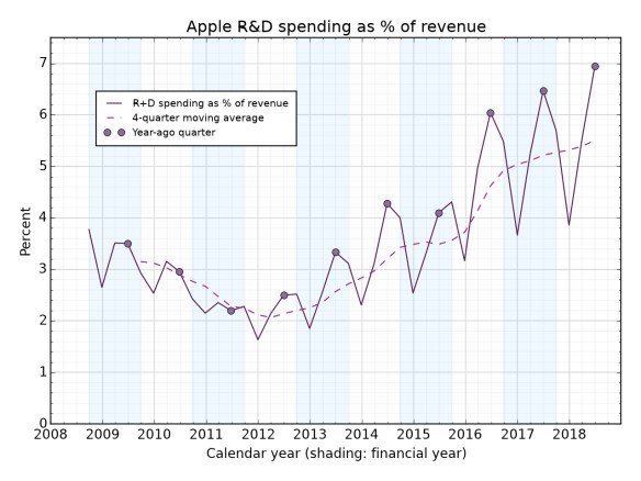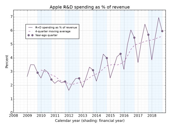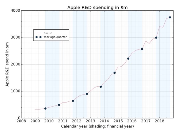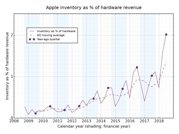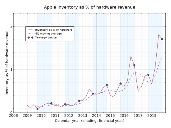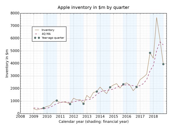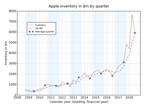 But if you look at it as a percentage of hardware revenue, inventory is really high. REALLY high. Heading up to 2%, which implies lots of things sitting in warehouses. I’ve had a look at Apple’s filings, and it doesn’t break down inventories into raw goods/work-in-progress/finished, so we can’t know if that’s self-driving cars being built or the iPhone XR (then unreleased) sitting in Chinese factories. Probably the latter, mostly.