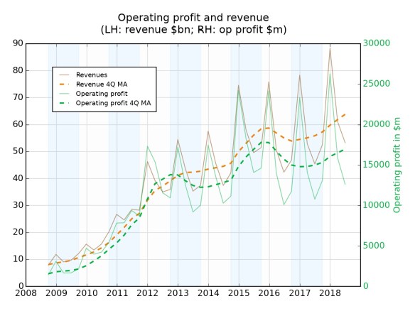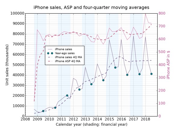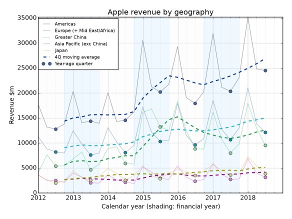 Apple released its fiscal fourth-quarter results (calendar third quarter) to the end of September on Thursday. So following up on my post from earlier this week, here’s what the data tells us about that period – which already feels like it’s in the rear-view mirror, what with the iPhone XR and new iPads and Macs having been launched just in the past couple of days, mid-quarter.