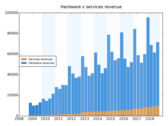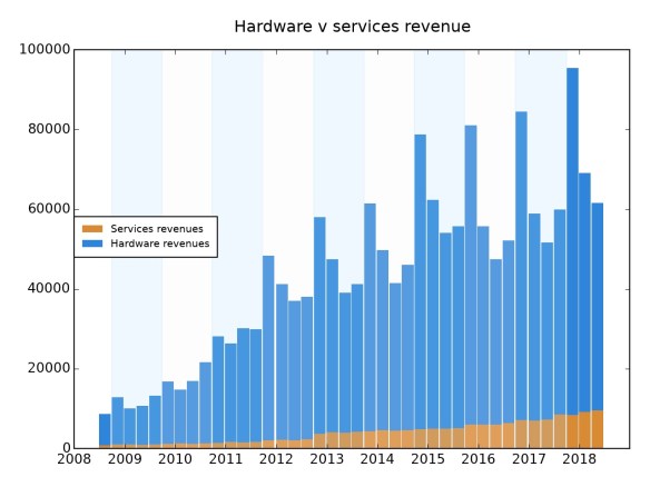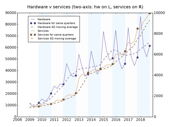 And now – apologies for its slight lack of clarity – the growth in Hardware (on the left axis, in purple) v Services (on the right, in brown). Services is growing faster than Hardware.