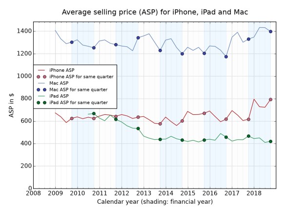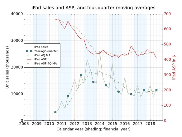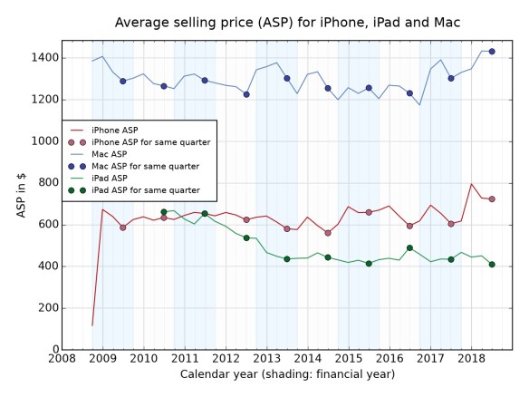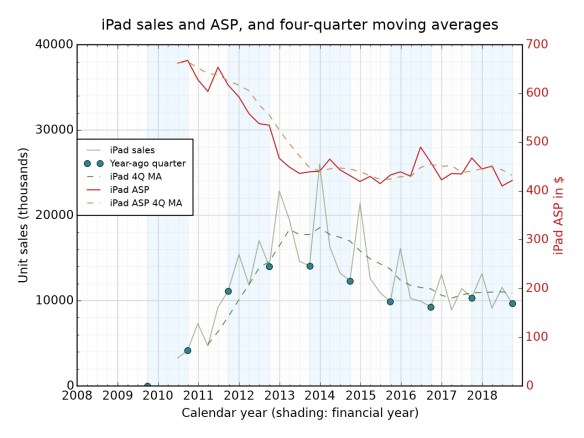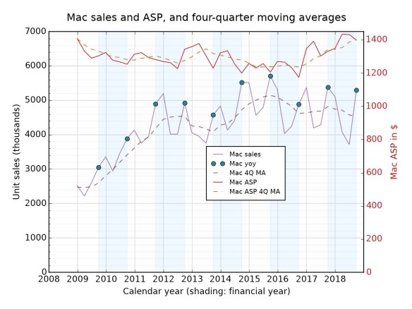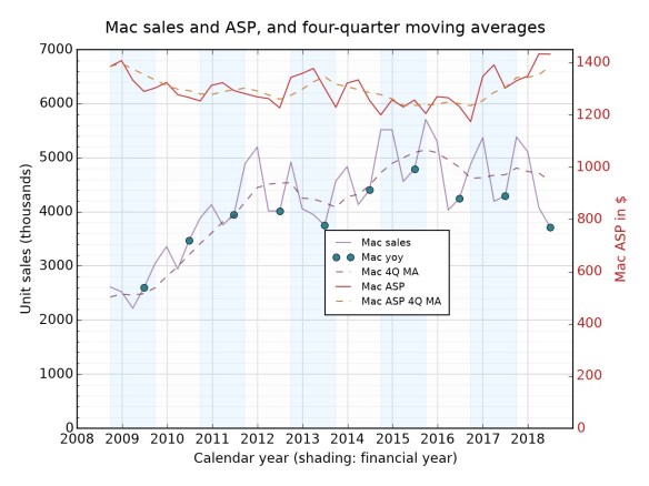 How about Macs? Sales are once more flat (the line with dots), ASPs are up. That ASP line will probably go up next quarter – though we won’t know exactly how much.