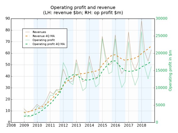 But analysing the effects of those is going to be more difficult than this: Apple announced that it’s no longer going to provide unit sales data. We’ll only have revenues for iPhones, iPads and Macs. This is being interpreted as an attempt to hide bad news that’s surely on the way for unit sales; Apple isn’t happy about this interpretation, and insists that its user base is growing, and that a focus on unit sales – the horse race – distracts from what’s really going on. It wants people to look at the growth in (high-margin? We’ll find out because it will reveal, next quarter) areas such as Services.