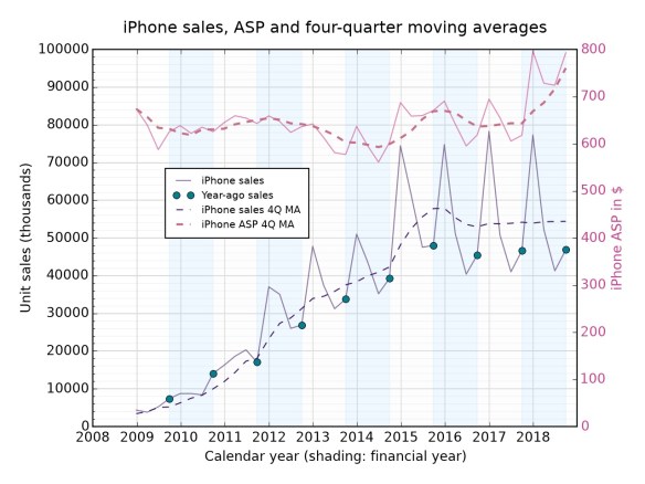 Now some more detail on the iPhone. Look at that uptick in ASP! And look at how flat sales are on the 4Q moving average. The growth has gone out of the market overall; global smartphone sales were actually down 6% in this period, so Apple actually grew its share by standing still.