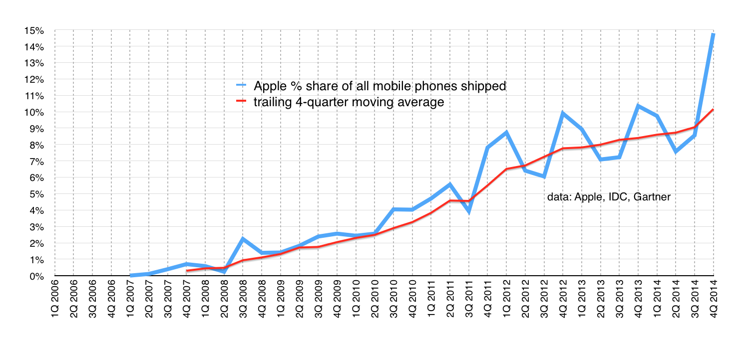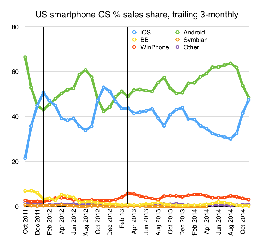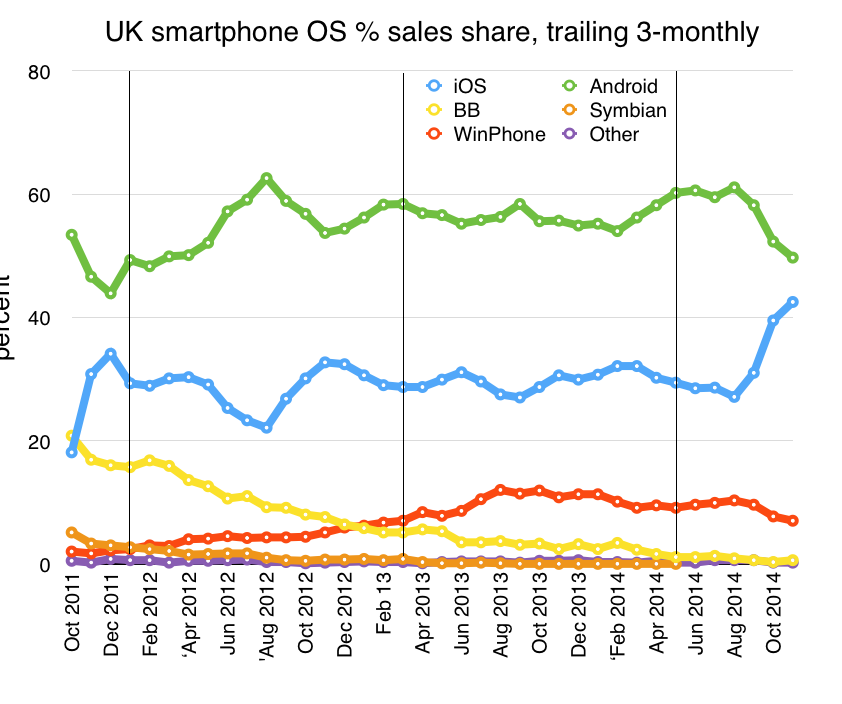 Even so, I can’t help thinking that rather as with Microsoft and Internet Explorer, the chance to act decisively has long been missed. Instead, a different phenomenon is pushing Google’s dominance on the desktop aside: mobile. Mobile ads are cheaper, see fewer clicks, and search is used less compared to apps. I’d love to see a breakdown of Google’s income from mobile between app sales and search ad sales (and YouTube ad sales): I wonder if apps might be the bigger revenue generator. Yelp, meanwhile, seems to do OK in the new world of mobile. It’s possible – maybe even likely – that Google’s dominance of the desktop will be, like Microsoft, broken not by the actions of legislators but by the broader change in technologies.